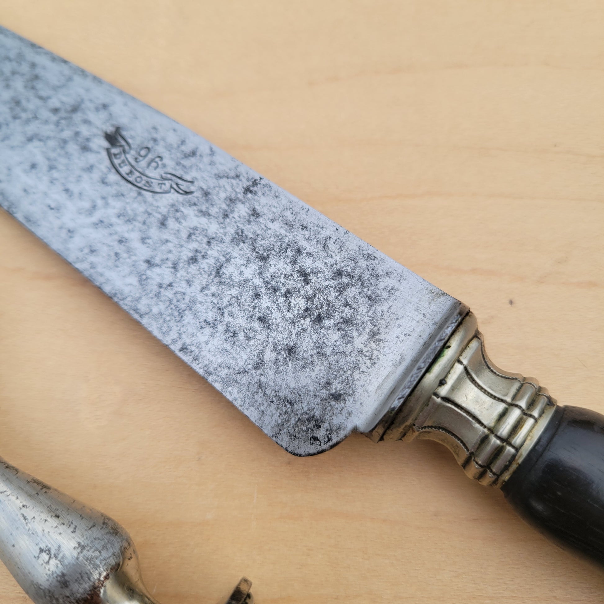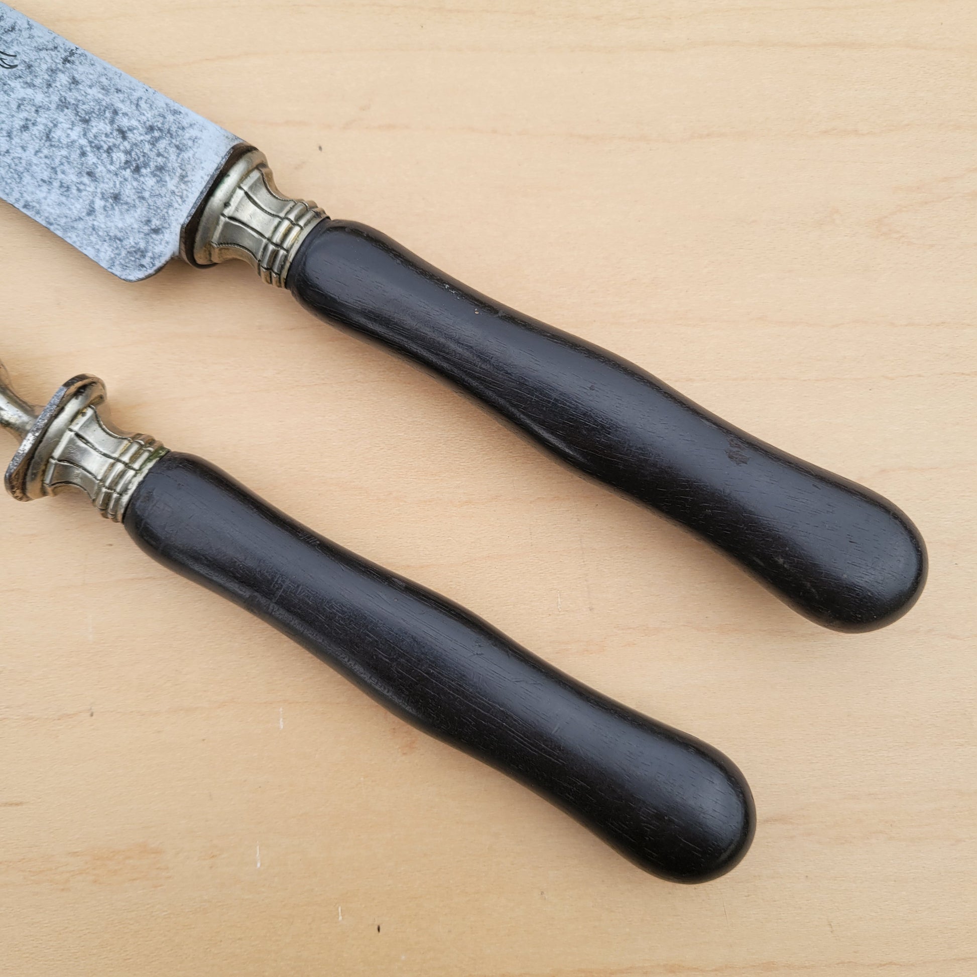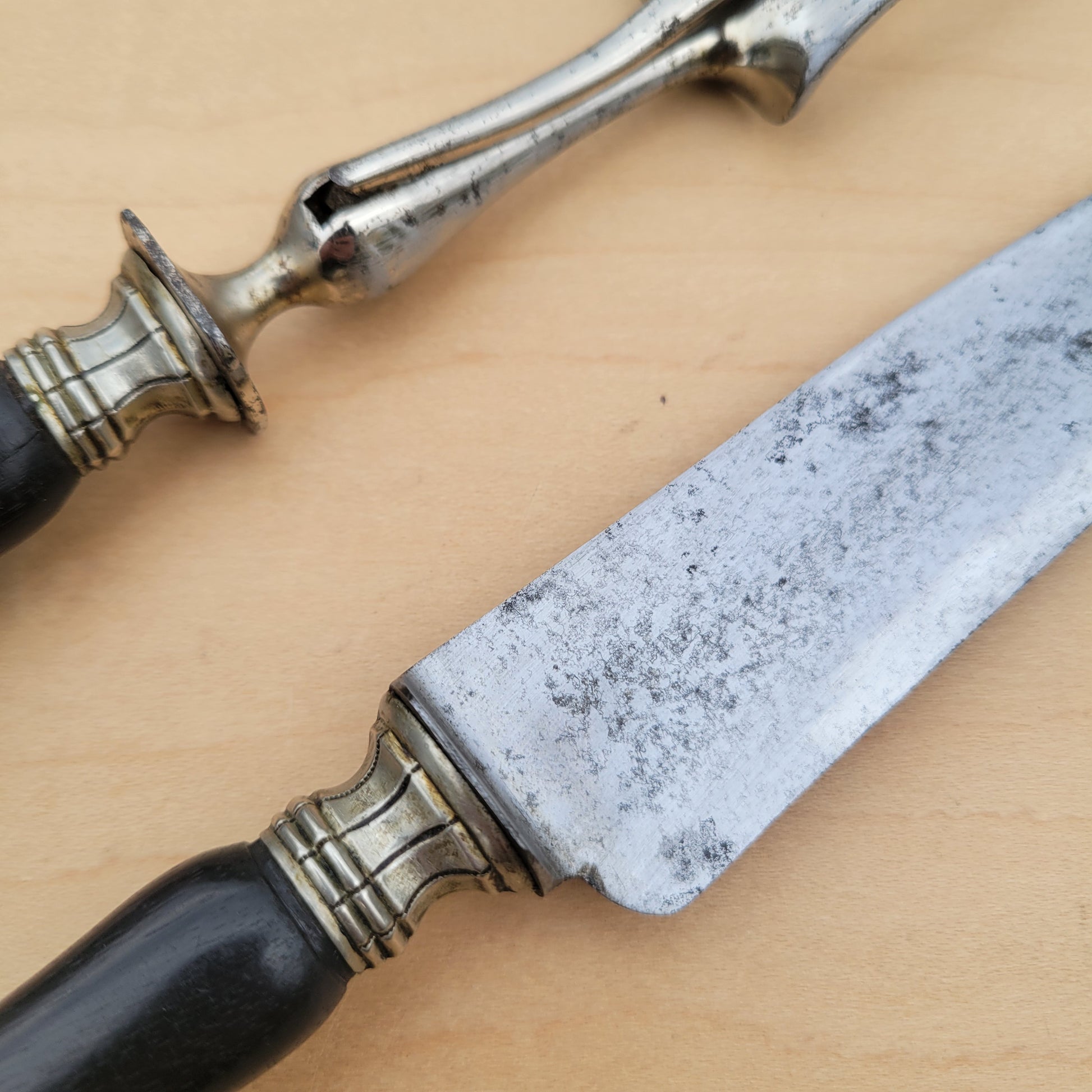 Knife and three prong fork, ebony wood handles are in good shape. Blades fairly pitted, but completely usable.