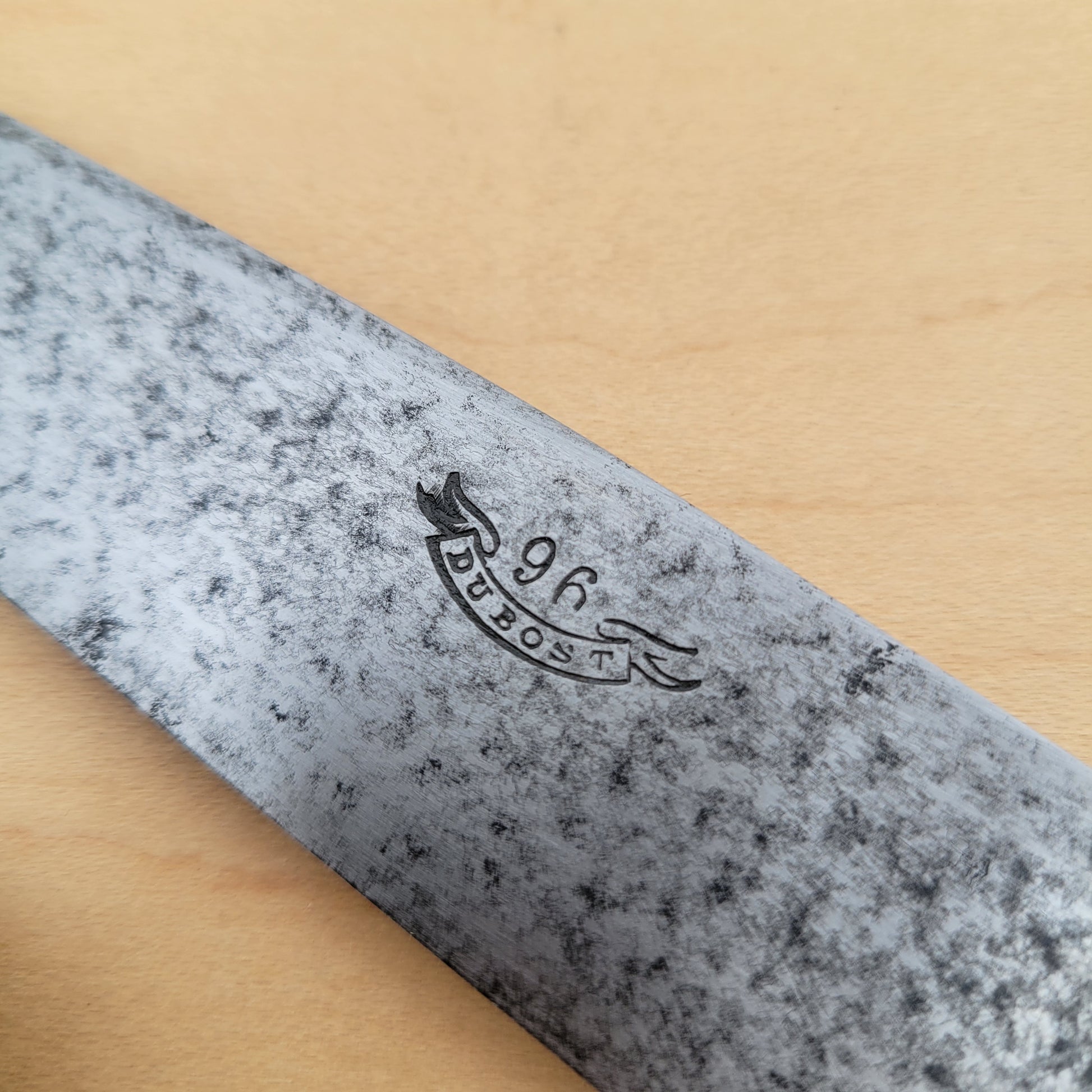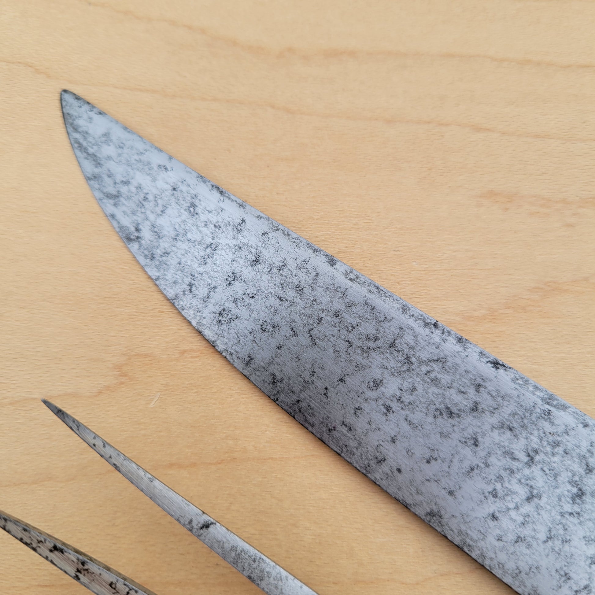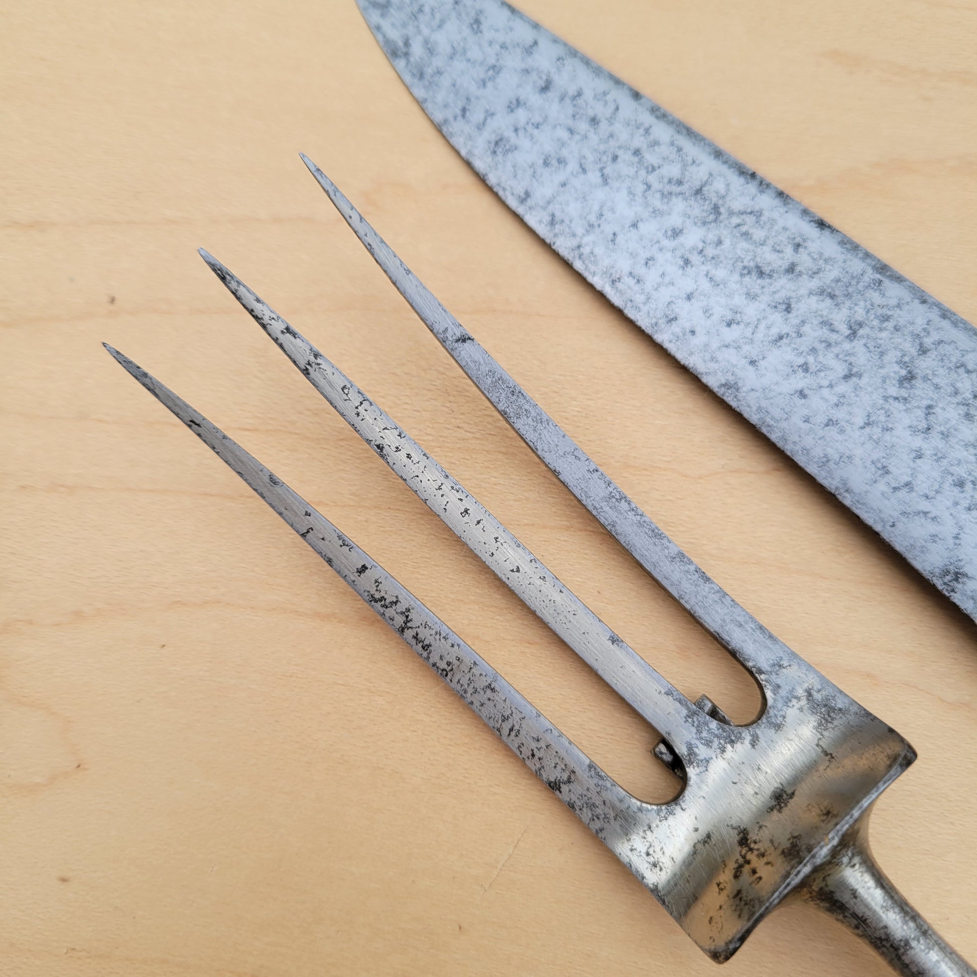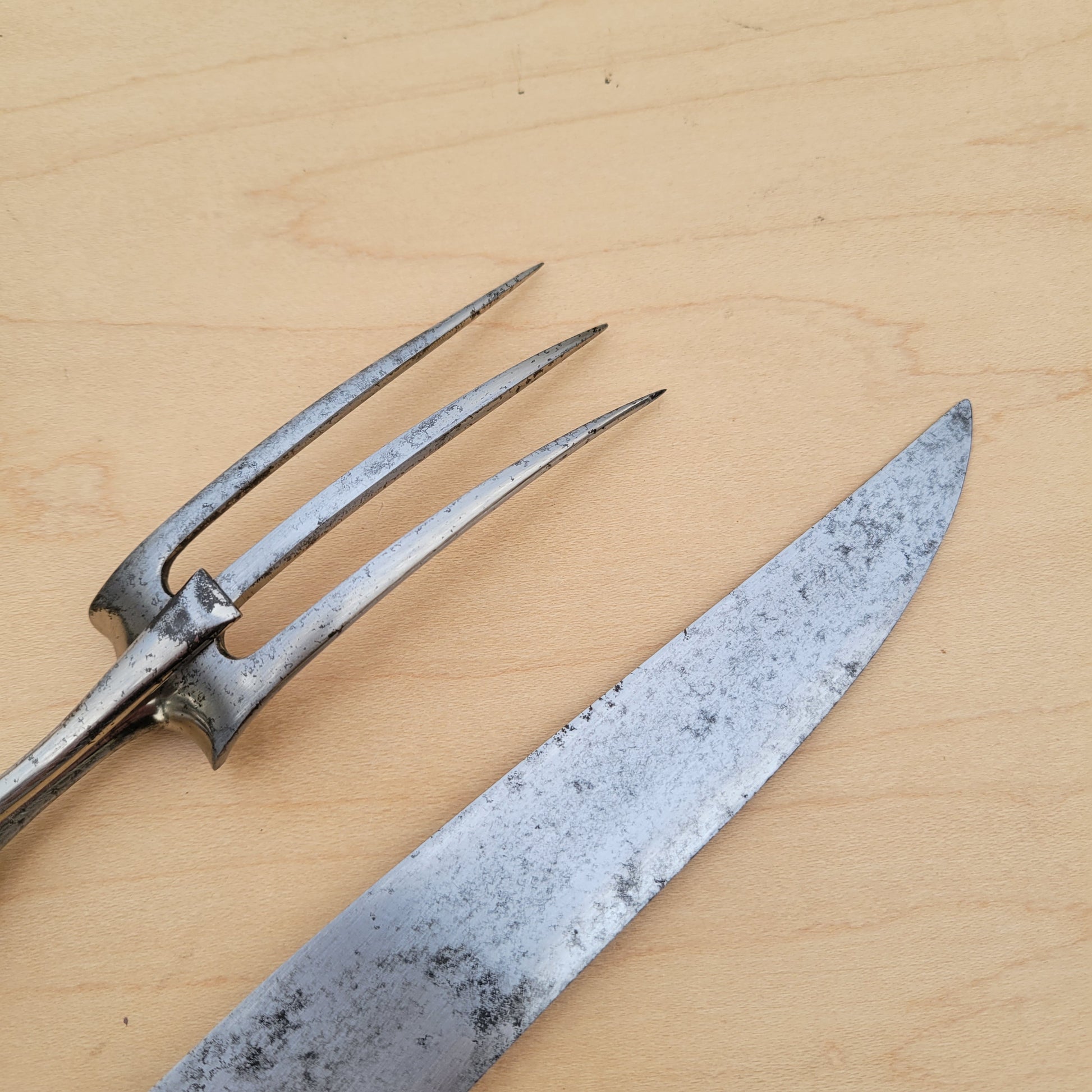 Knife and three prong fork, ebony wood handles are in good shape. Blades fairly pitted, but completely usable.
