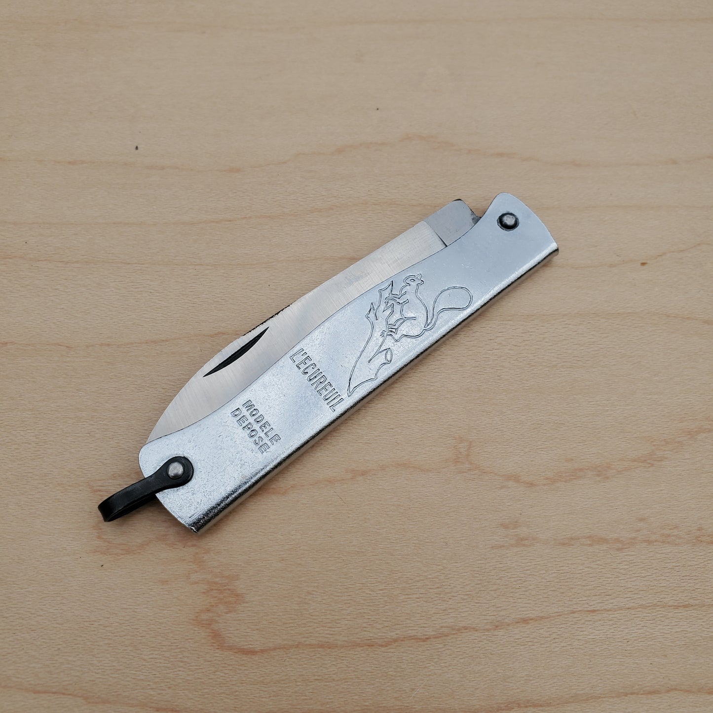 Made in France by Coutellerie Cognet, 'L'ecureuil' or, The Squirrel, folding knife features a drop point carbon steel blade set into a stainless steel handle, slip-joint mechanism with half stop and bail.