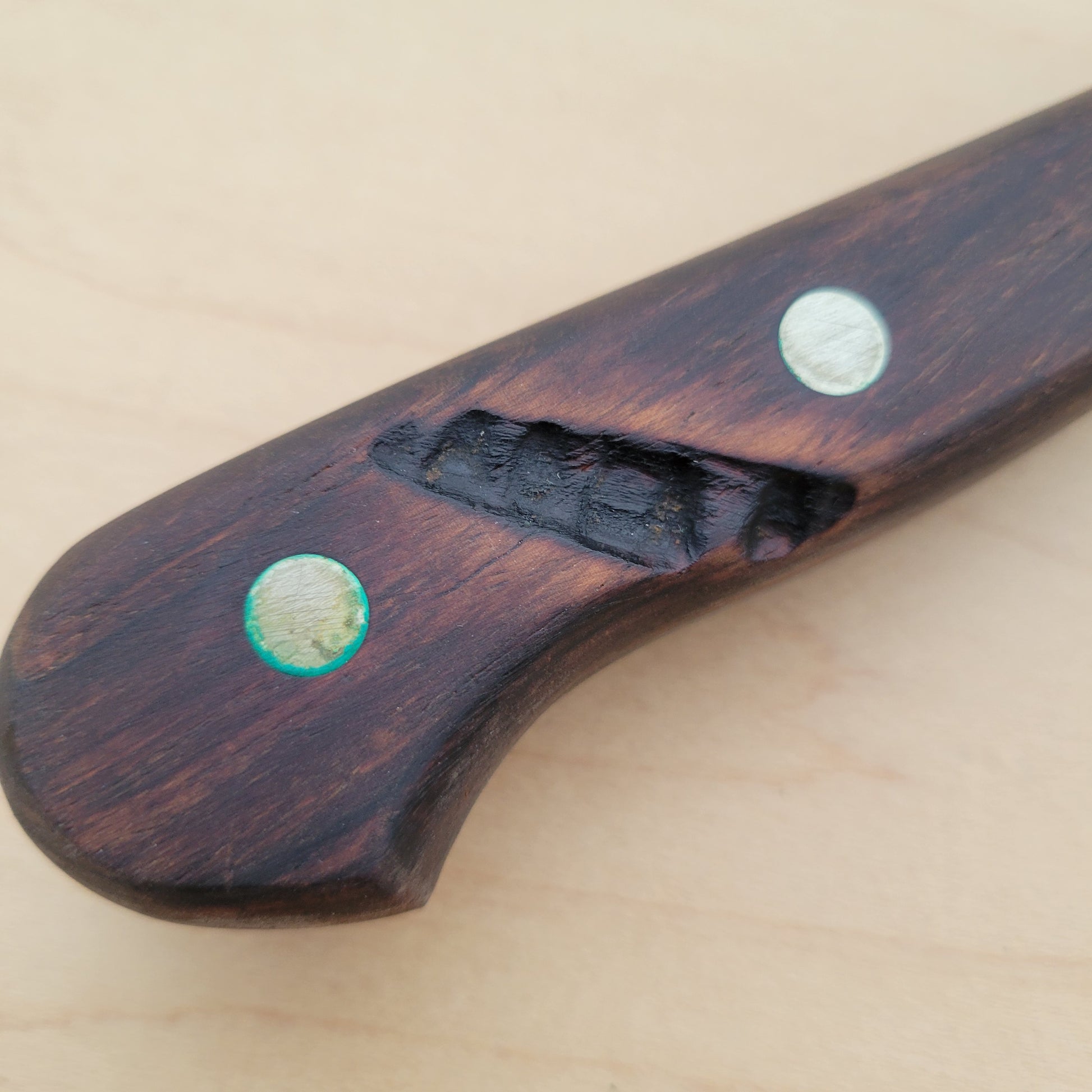 Hand forged USA made Dexter chef knife. Handle has a burn shown in photos.