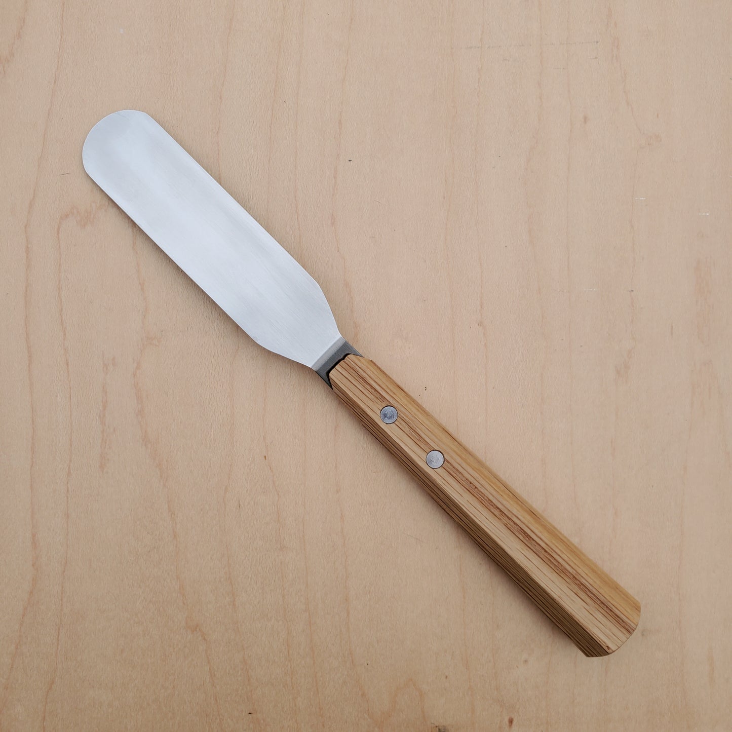 An elegant plating, turning and pastry tool, a bit wider than the smaller offset spats commonly found in pro kitchens and with a six sided oak wood handle.