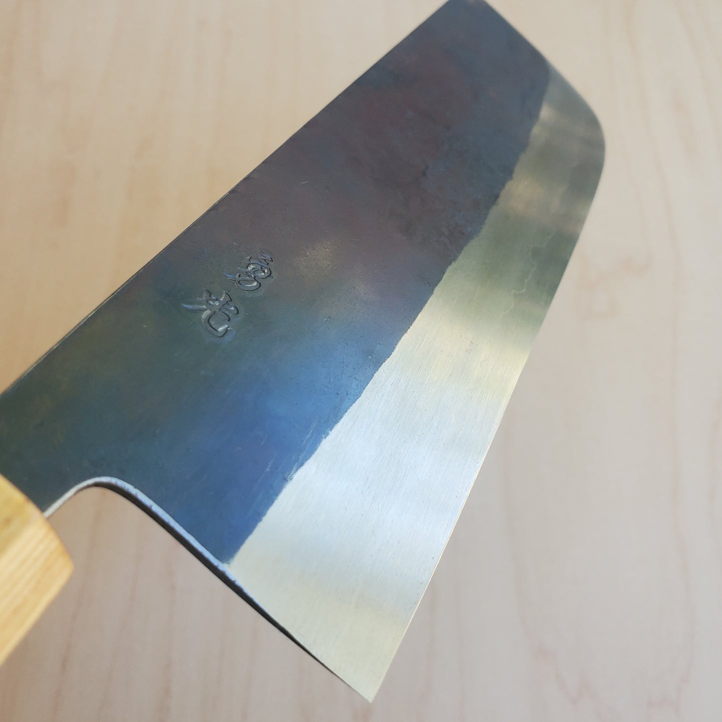 These knives sport a hard Shirogami #1 carbon steel core and have a stainless cladding, which make them easier to care for. The blades have a black kurouchi finish on the face, and the bevels are finished with a satin polish. These are extremely high performing knives thanks to excellent grinds and heat treatment.