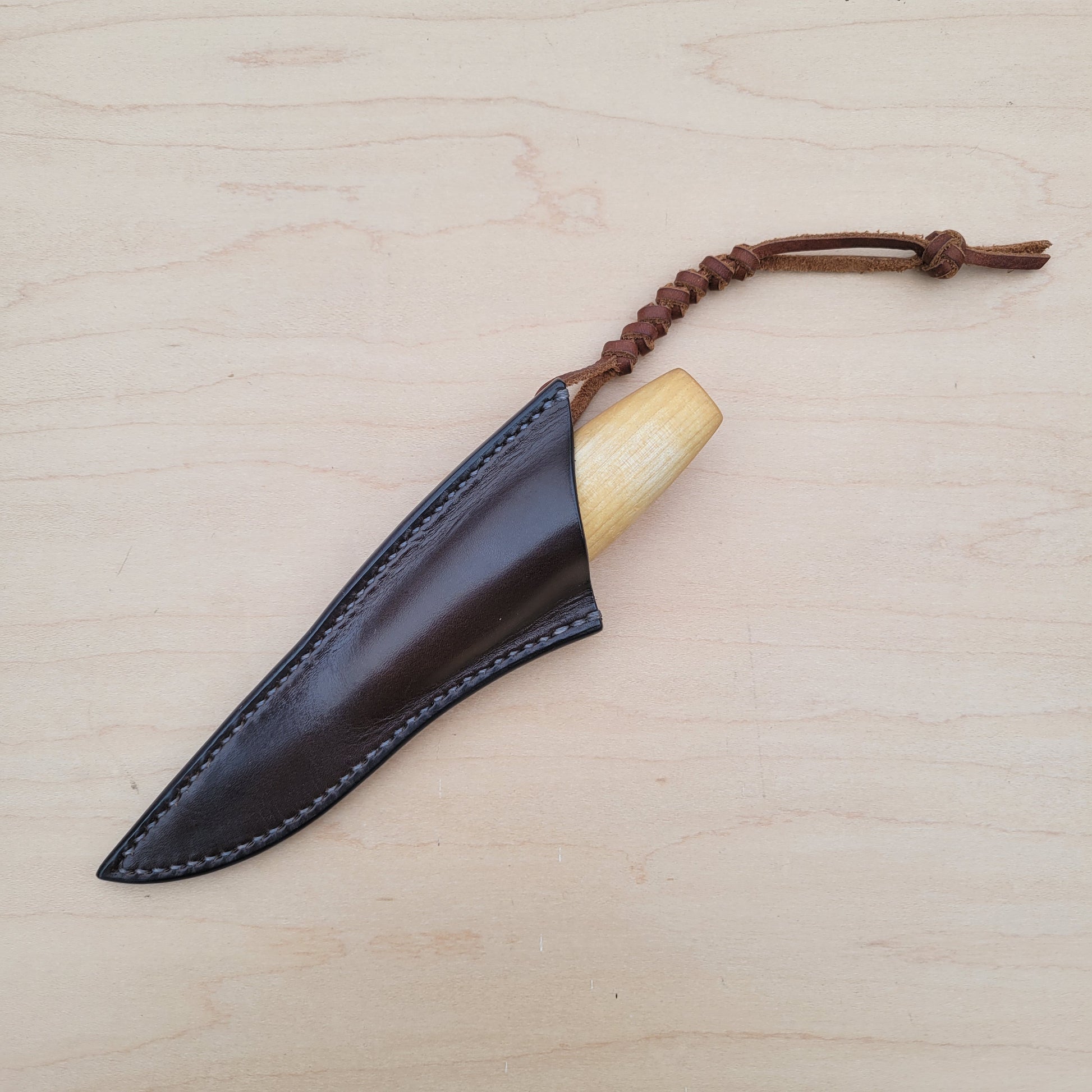 Specifically designed to fit the Morakniv 120 and 122 wood carving knives, for someone looking for a nice upgrade from the included plastic sheaths. Friction fit with a leather lanyard.