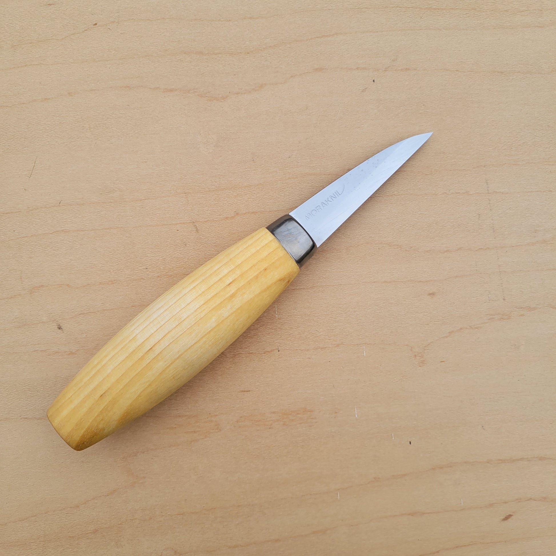 The Moraknive 122 has a flat blade profile, no curve. A classic knife by Morakniv, and a ubiquitous blade shape designed for woodcarving and whittling, also known as a "Sloyd Knife" Full tang construction with a solid wood handle. A must have in any craftsman's tool kit. Bulk packed. Made in Sweden.