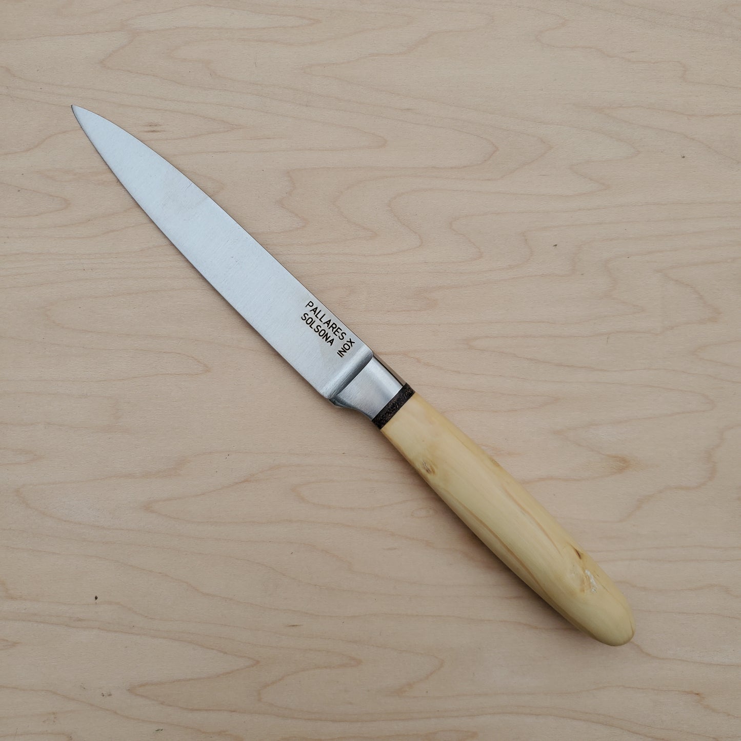An elegant paring knife with a durable boxwood handle with leather spacers. Pallares professional series knives are forged blades made with easy-to-sharpen stainless steel.