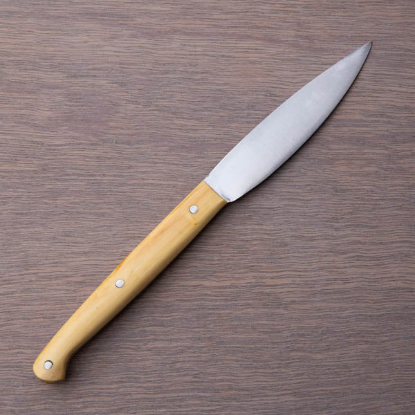 These classic and simple table and steak knives are at home with any meal. Who doesn't like a good sharp knife to eat with? The shape on these slim knives from Pallares is a little different than the typical steakhouse style, more of a 'leaf' shape, with a nice pointy tip that's more in the center of the profile. The construction is full tang, with wood scales held on with three steel pins. They are a hand constructed, shaped and finished, and each one has its own subtle variances.