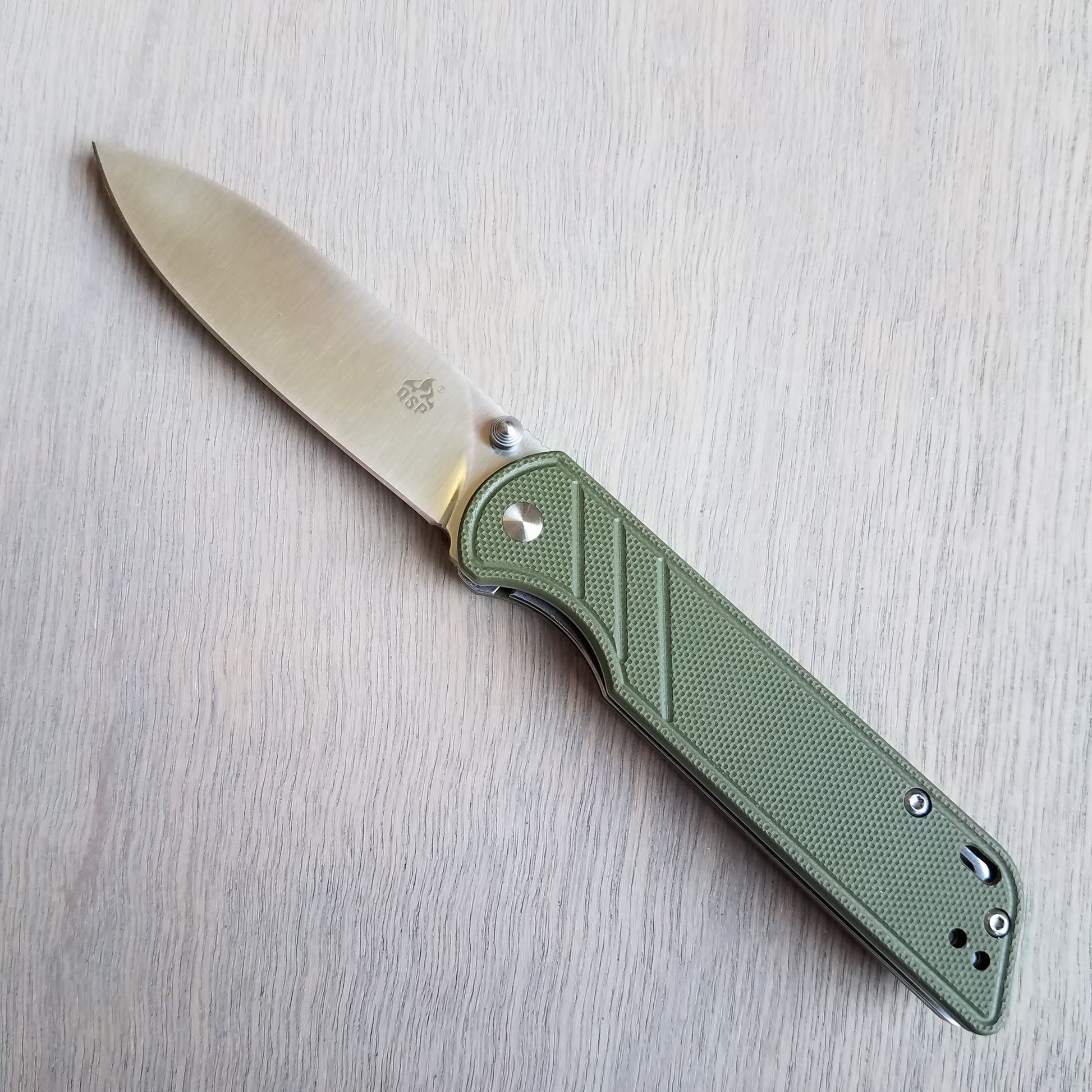 Probably one of the best deals on a folding knife around, the QSP Parrot features ball bearing washers for smooth opening, a durable liner lock, a D2 spear point blade, reversible pocket clip, G10 handle, and thumb studs for easy opening.