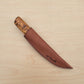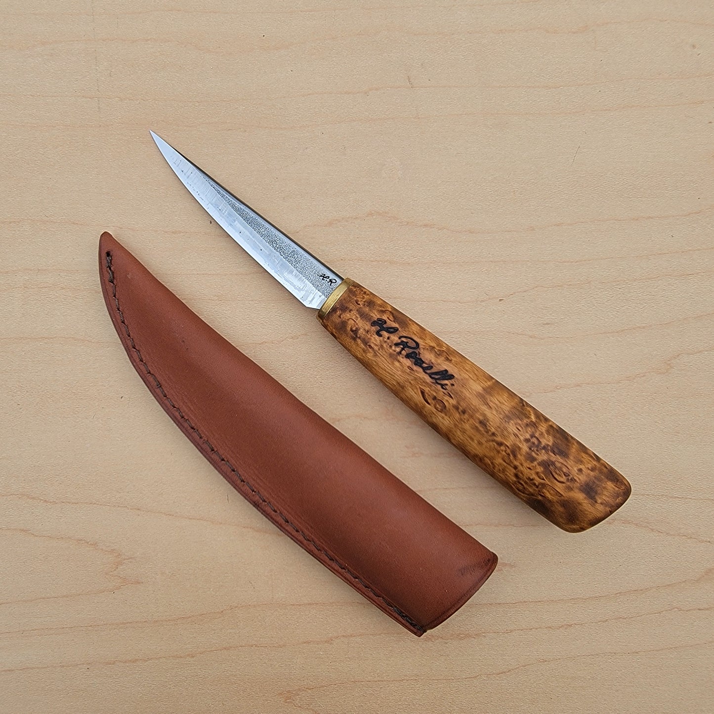 A beautiful detail carving and whittling knife with a precise Scandi grind, easy to sharpen and strop to keep extra sharp. Rounded spine and exceptional fit and finish on these.