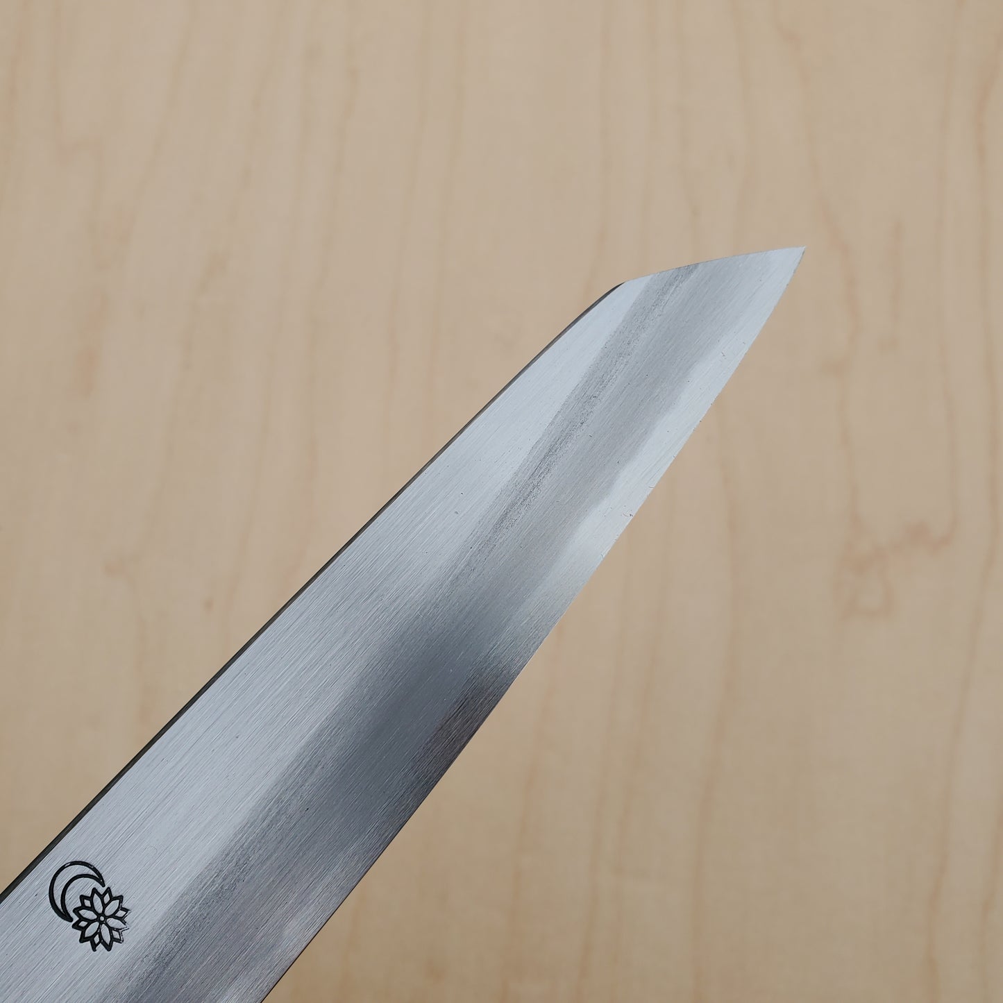 Sakai Kikumori’s Kikuzuki Kasumi series feature a subtle satin finish, ambidextrous wide bevel style grinds, and rounded and polished choil and spine. They are forged at Tanaka Hamono, one of the best in the business in Sakai city. They manage to coax toughness, hardness, edge life and sharpenability out of the steel, which is not easy!
