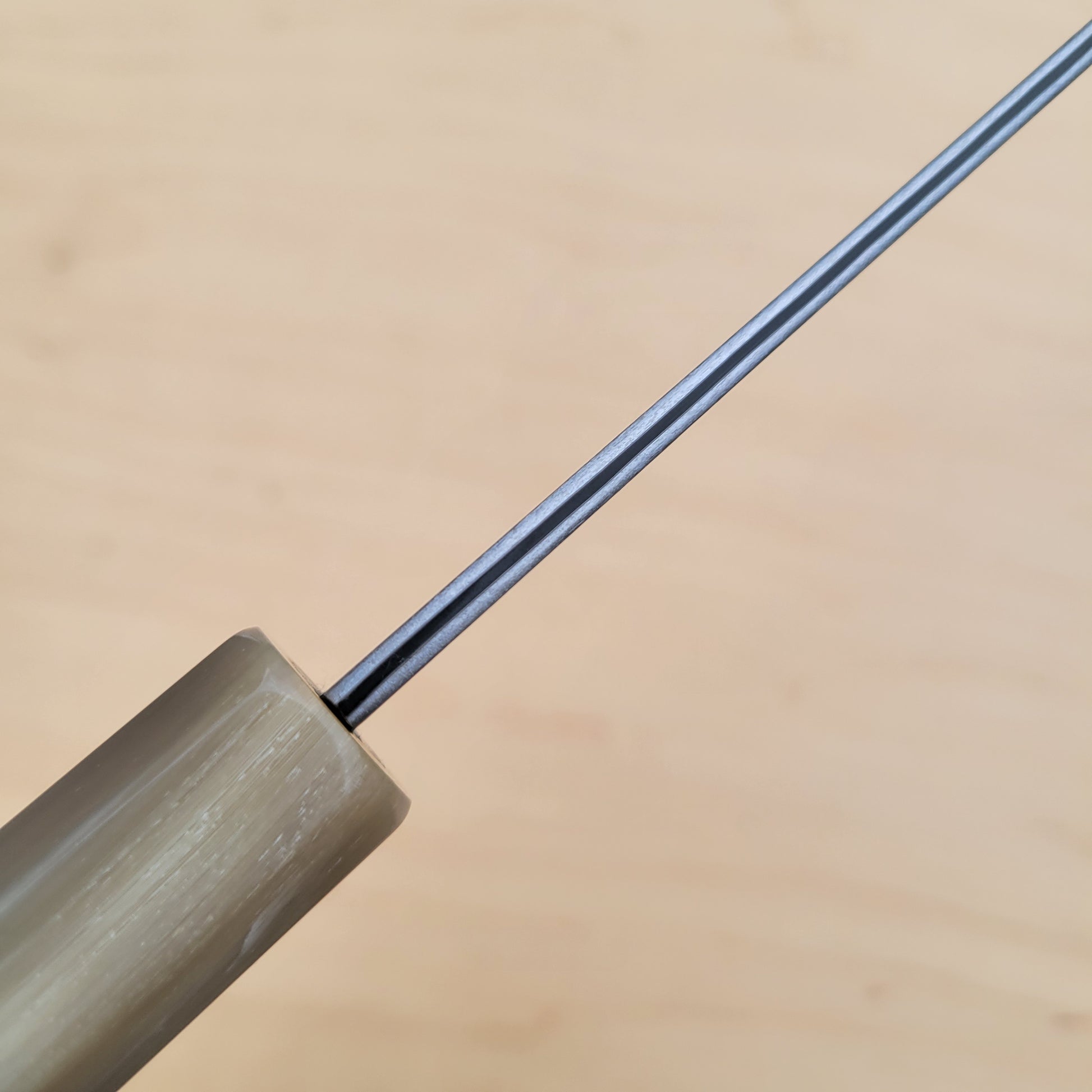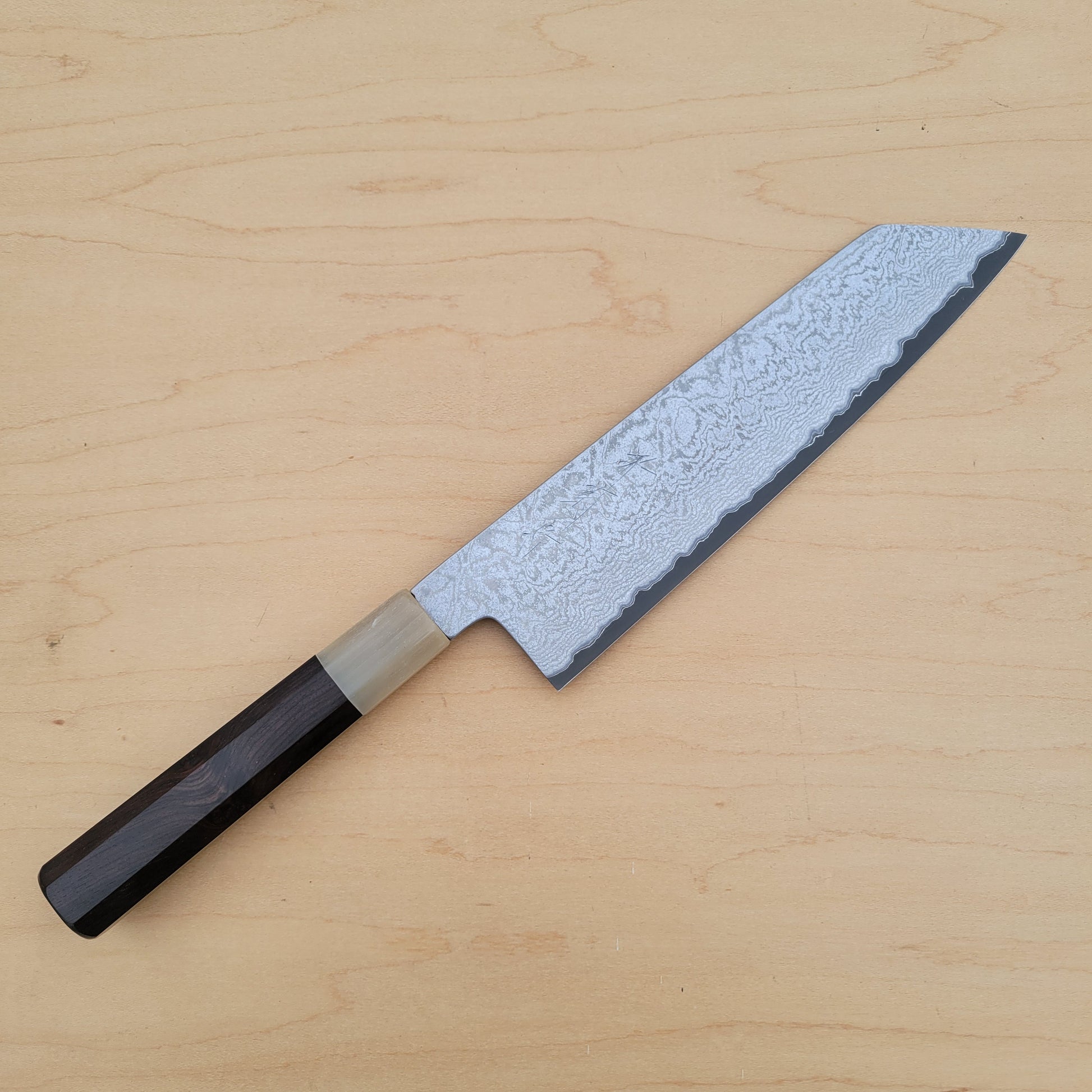 Sakai Kikumori’s Yogiri series is super special, forged in very limited batches. It features the expert forging of master smith Yoshikazu Tanaka, who utilizes Aogami Super steel and clads it with an unusually beautiful stainless damascus cladding. The knives are ground convex with a bit of heft but still thin on the edge, and then have a deep acid etch, bringing out the really bringing out the textures of the finish. Handle is an octagon ebony wood with blond buffalo horn.
