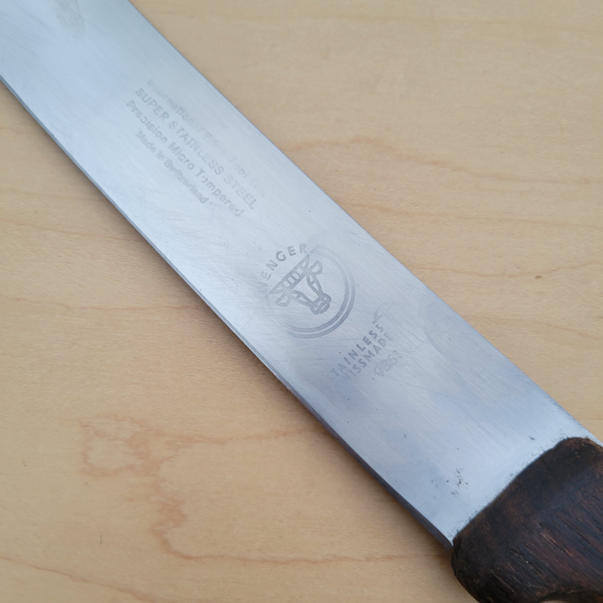 Made in Switzerland, Wenger brand stainless steel scimitar with wood handle.