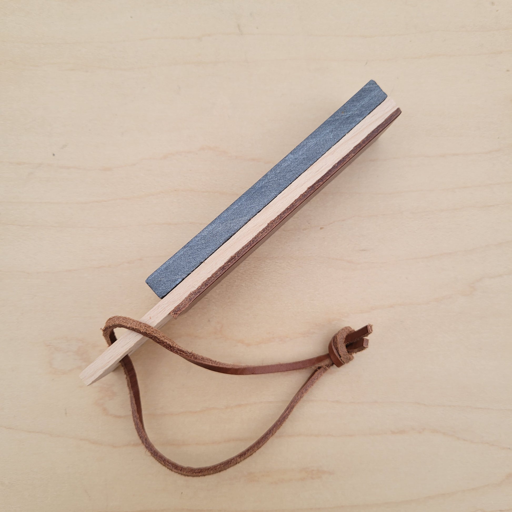 Small sharpening and honing tool. One side is Pyrenees 'Grey Gold' natural stone, the other side is fine cowhide leather. Mounted on beech wood with leather tie.