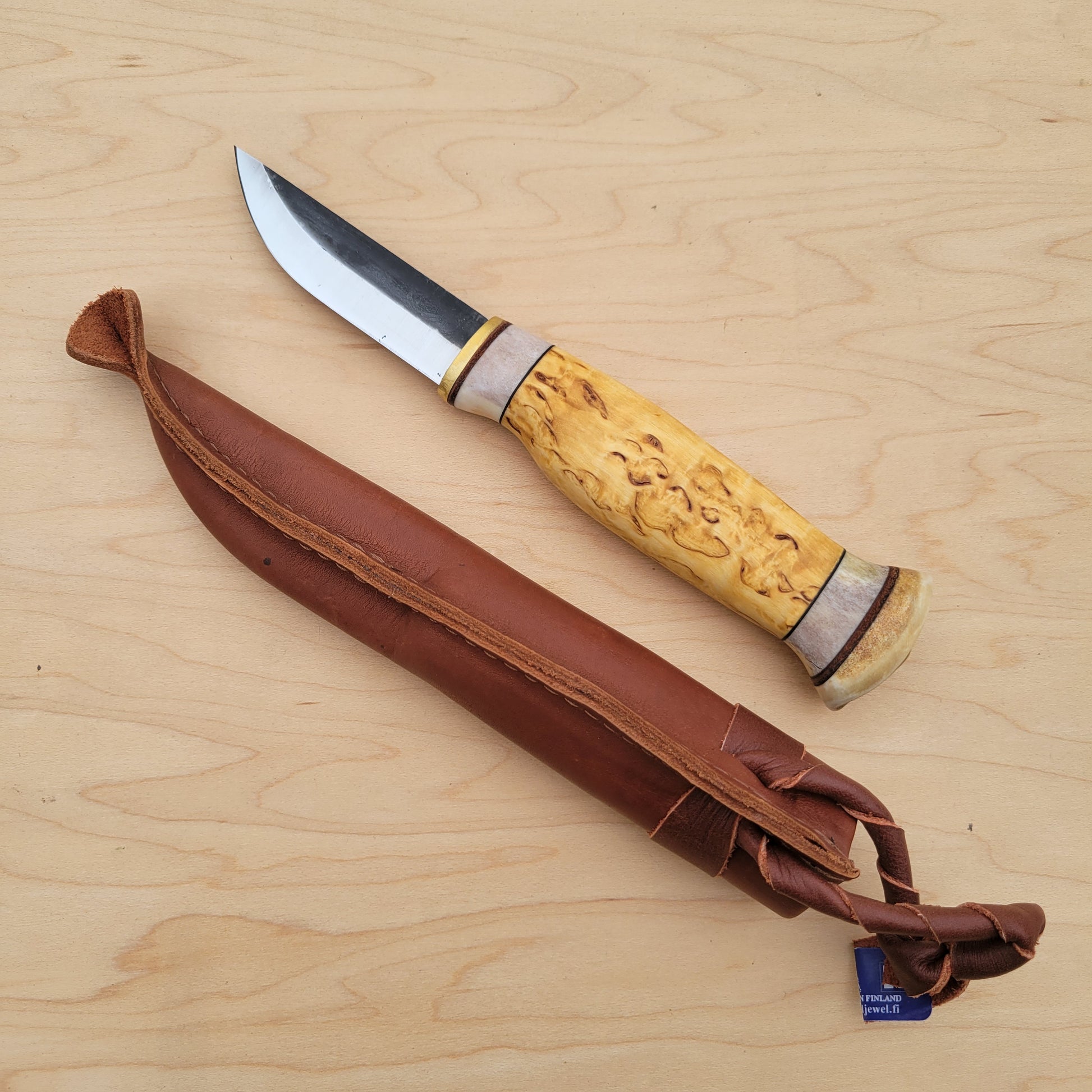 Wood Jewel knives are made in Finland, in the traditional style, and come with leather belt sheaths.