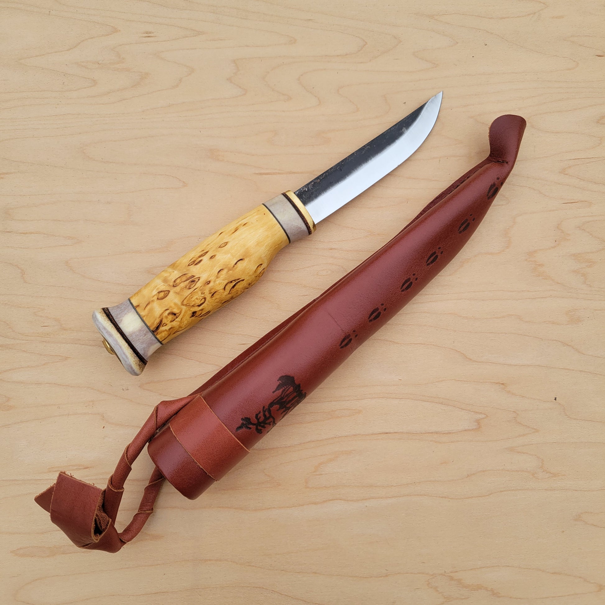 Wood Jewel knives are made in Finland, in the traditional style, and come with leather belt sheaths.